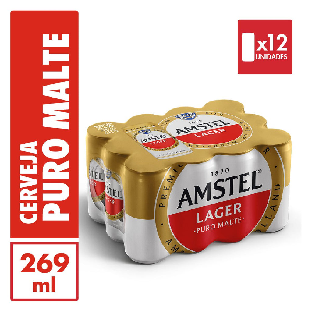 Pack com 12 latas de cerveja Amstel Lager, cada uma com 269 ml. Cerveja do estilo lager com sabor leve e refrescante, apresentando coloração dourada clara, aroma suave de malte e lúpulo, e paladar equilibrado com final limpo. Ideal para consumo gelada em encontros, festas ou refeições variadas. Teor alcoólico em torno de 4,7 % por lata.